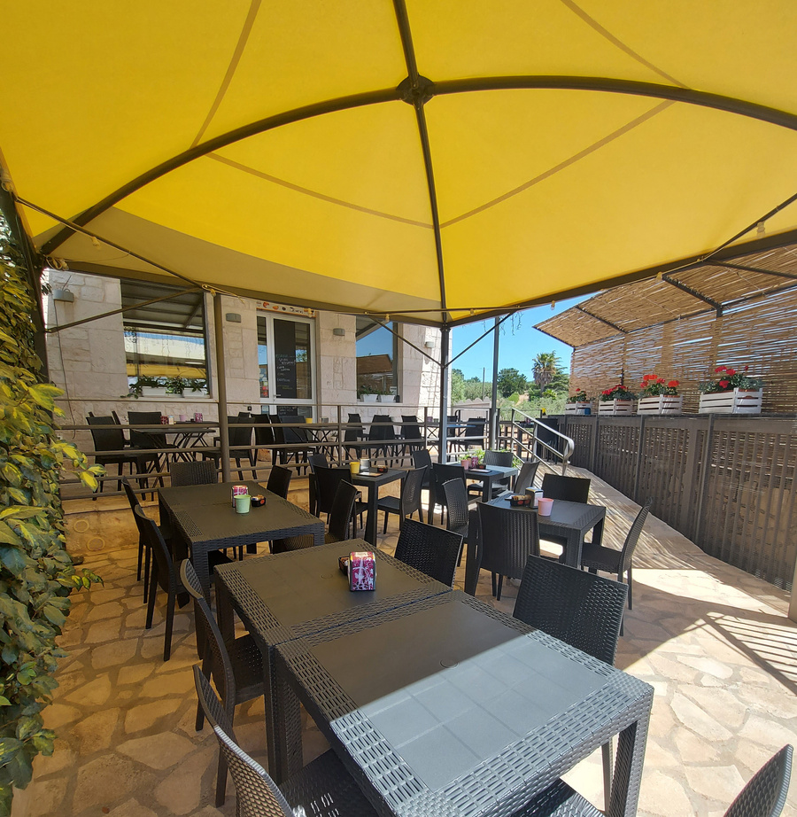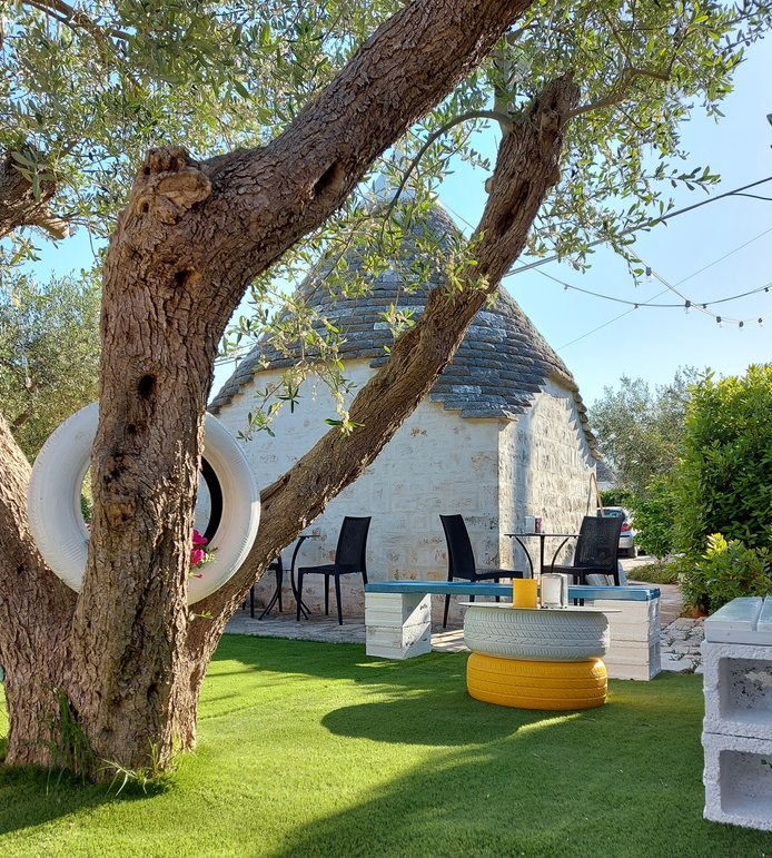 un piccolo giardino colorato, con tavolini e panche, dove potrai fare colazione all’ombra di un ulivo o del nostro trullo.